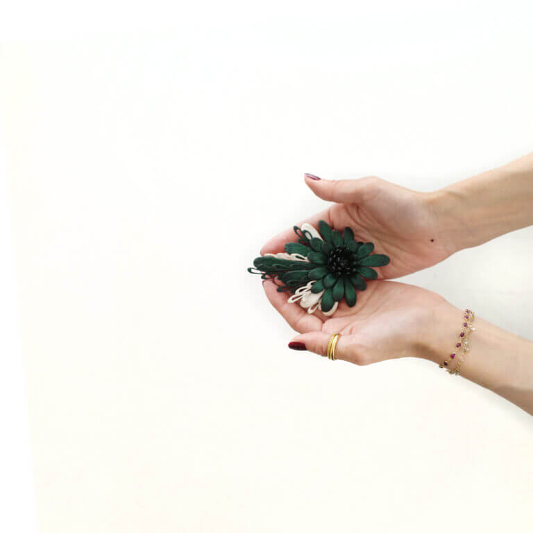 群馬県・桐生に伝わる「横振り刺繍」の技術を活かし、微細に染め分けた国産の絹糸を使用して仕上げる世にも美しい刺繍花。全ては作家・高澤恵美の頭の中にある架空の花であり、刺繍によって描かれたもの。