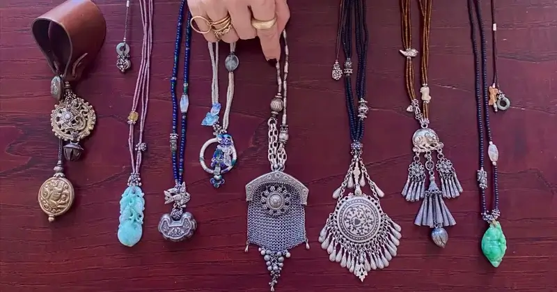 そのタイのお守りとアフガンのショール留め・インド民族の鈴などのアンティークと、ネパールのウサギの彫ち玉を使ったユニークな、